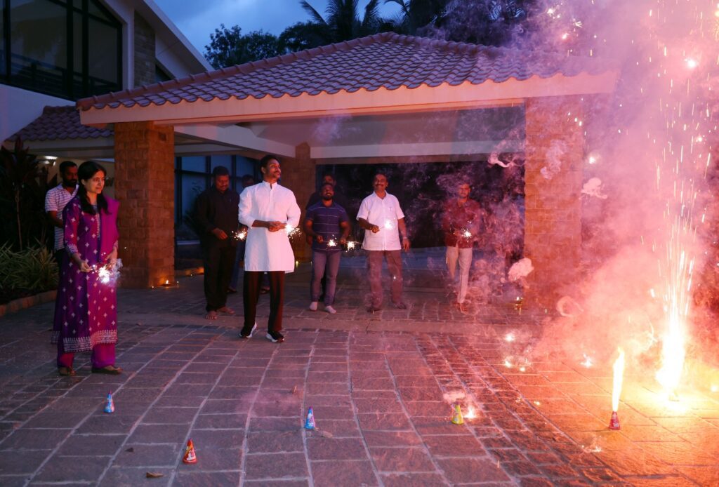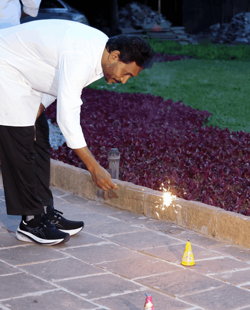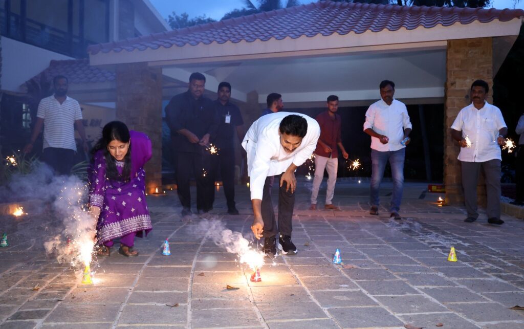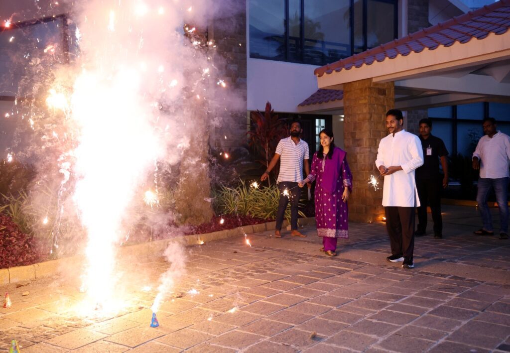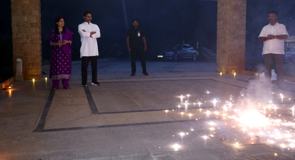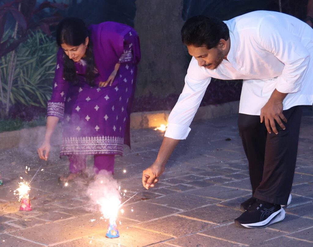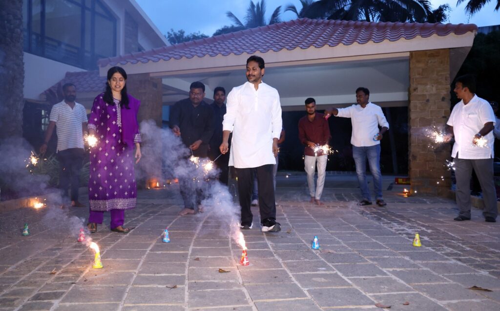 As part of the celebrations, Y.S. Jagan Mohan Reddy and his wife, Y.S. Bharathi, lit diyas and burst crackers, symbolizing the triumph of light over darkness and good over evil.
