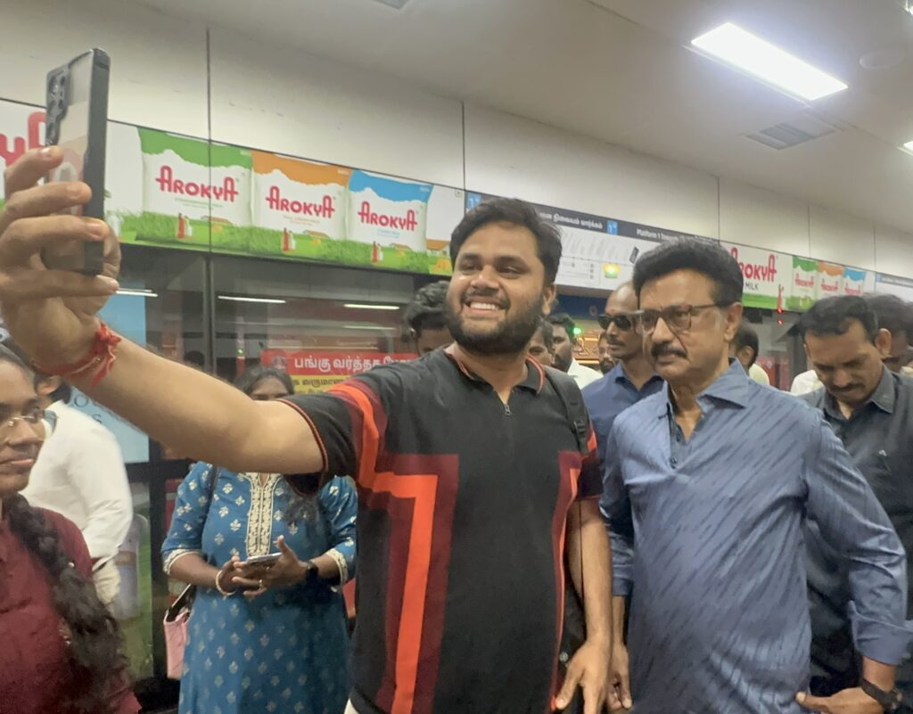 Stalin boarded a crowded metro from Central to AG-DMS. During the journey, he interacted with daily commuters. He asked them to support Dravida Munnetra Kazhagam (DMK) and its rising sun symbol.