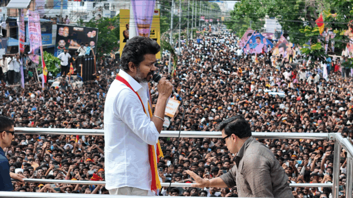 Joseph Vijay, founder of Tamilaga Vettri Kazhagam (TVK), drew...